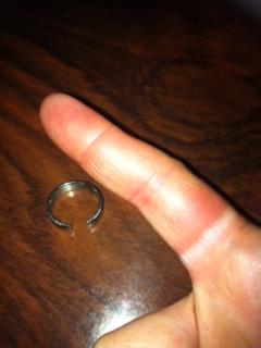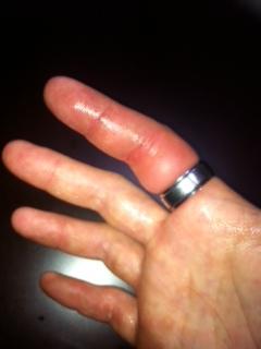 今まで薬指にしてたリングがサイズが合わなくなったんで最近は人差し指にしていたんです。で、12/30にそのまま飲みにいって、12/31の朝起きたらもう大変なことになっていました、私の指。