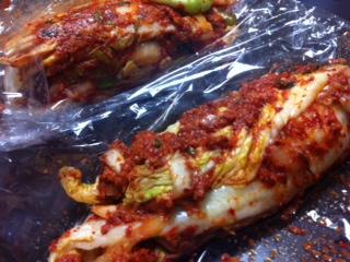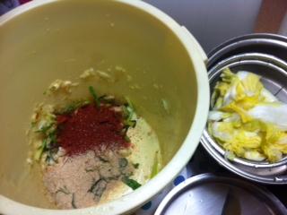 キムチです!!!大量のニンニク、生姜、おネギ類、リンゴ、すりごま、いわしのエキス、、、などなど!!!夜な夜な泣きながらヤンニョムを作り、只今放置中です